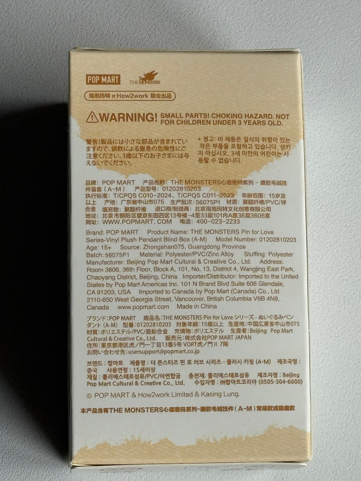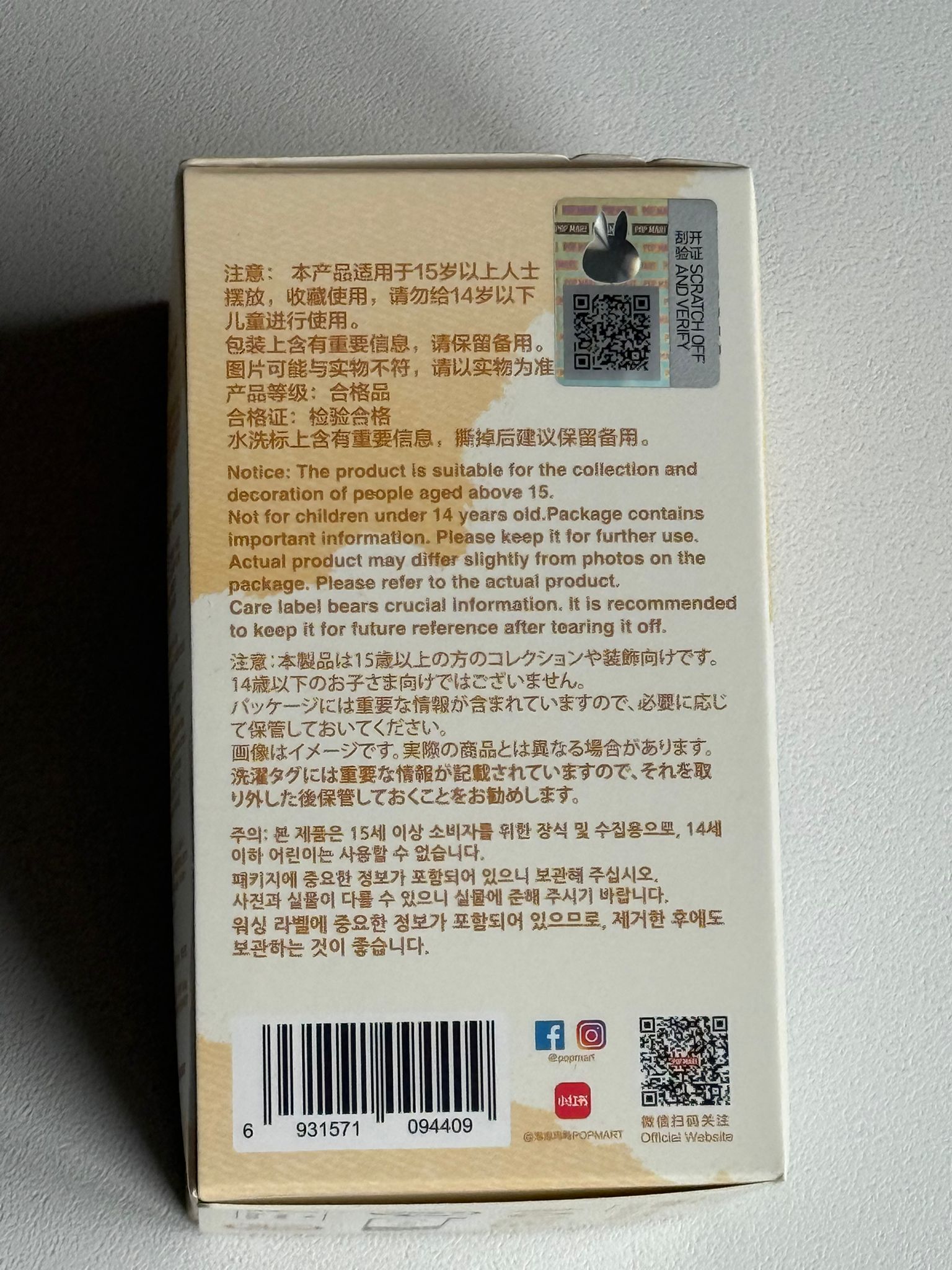 Äktheten kan verifieras via QR-koden på baksidan av boxen: skrapa fram koden och ange de sista fyra siffrorna, eller skanna QR-koden direkt på Labubu-figuren för snabb verifiering.